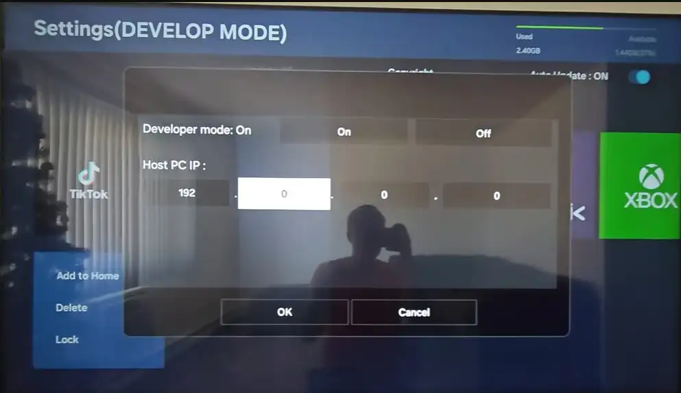 Włącz tryb deweloperski i wprowadź adres IP komputera lub serwera, z którym telewizor ma się połączyć. Po zapisaniu ustawień wyłącz telewizor i włącz go ponownie. Po ponownym uruchomieniu ustawienia zostaną zastosowane, a telewizor będzie gotowy do pobierania i instalowania aplikacji Tizen z podanego adresu IP.