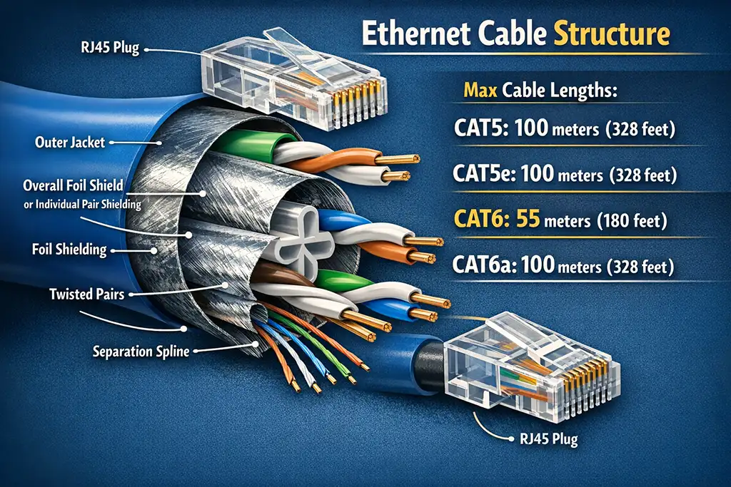 Maksymalna długość kabla wynosi 100 metrów (328 stóp) dla CAT5 i CAT5e. W przypadku CAT6 maksymalna długość wynosi 55 metrów (180 stóp) przy pracy z prędkością 10 Gb/s, natomiast przy 1 Gb/s może osiągnąć nawet 100 metrów. CAT6a obsługuje prędkość 10 Gb/s na odległość 100 metrów (328 stóp). W zależności od jakości kabla, kable te mogą również działać na większych odległościach, ale podane wartości stanowią podstawowe specyfikacje.