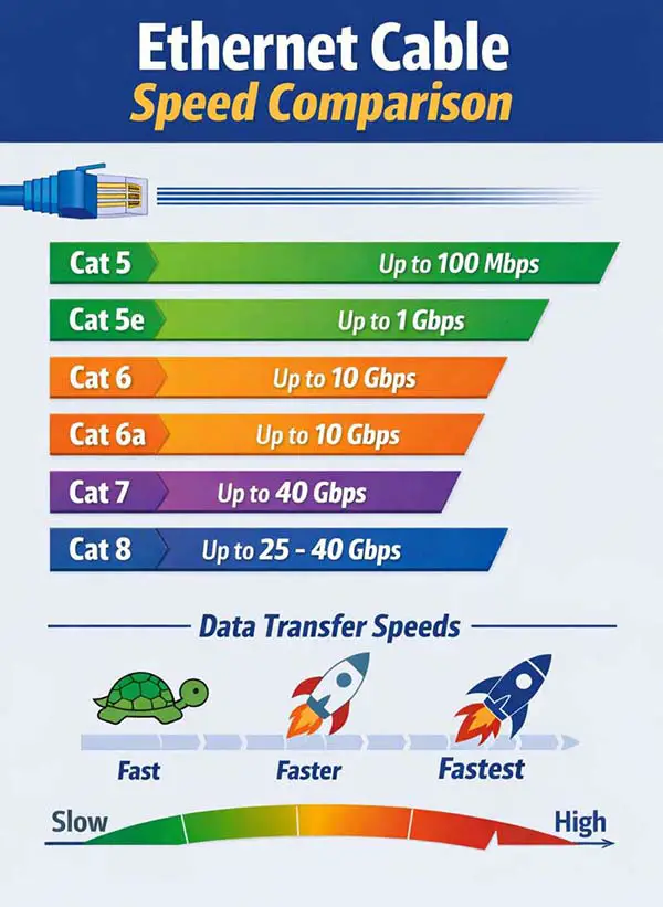Maksymalna obsługiwana długość kabla. Kable CAT7 i CAT7a obsługują prędkości transferu danych do 10 Gb/s na standardowej odległości Ethernet wynoszącej 100 metrów. Kable CAT8 są przeznaczone głównie do centrów danych i obsługują prędkości 25 lub 40 Gb/s na krótszych odległościach, zazwyczaj do 30-40 metrów, zachowując jednocześnie możliwość przesyłania danych z prędkością 10 Gb/s na dłuższych odległościach.