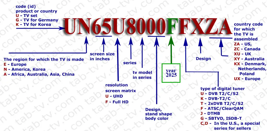 Po roku modelowym w numerze modelu telewizora pojawiała się litera, która mogła mieć dwa znaczenia: typ wyświetlacza lub rozdzielczość.