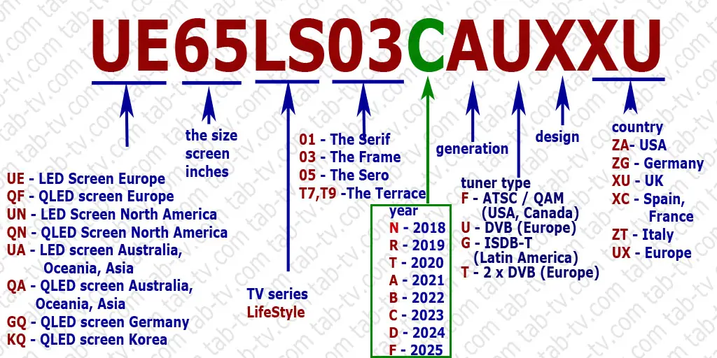 Numer modelu telewizorów Samsung: The Frame, The Serif, The Terrace, The Sero (serie 2018-2025)