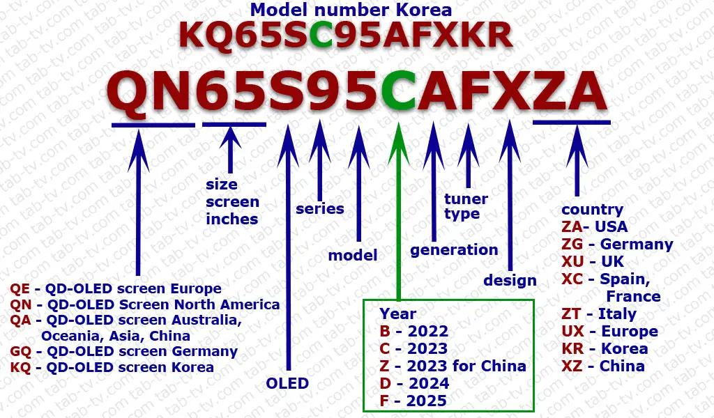Jako przykład, wyjaśnię, jak zdekodować numer modelu OLED TV z 2023 roku, QN65S95CAFXZA. Pokazałem również numer modelu telewizora Samsung OLED używanego w Korei, KQ65SC95AFXKR. W Korei numer modelu jest nieco inny, a litera wskazująca rok została przeniesiona na inne miejsce.
